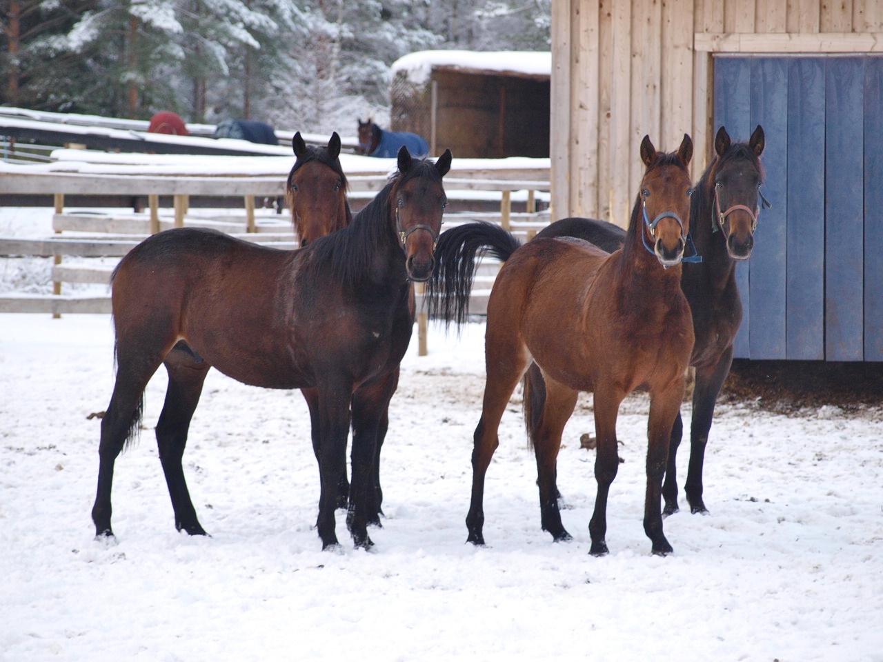 Hestene går i flokk med jevnaldrende, de har store områder å bevege seg på og rikelig med lune halmhus å gå inn i når de måtte føle for det.